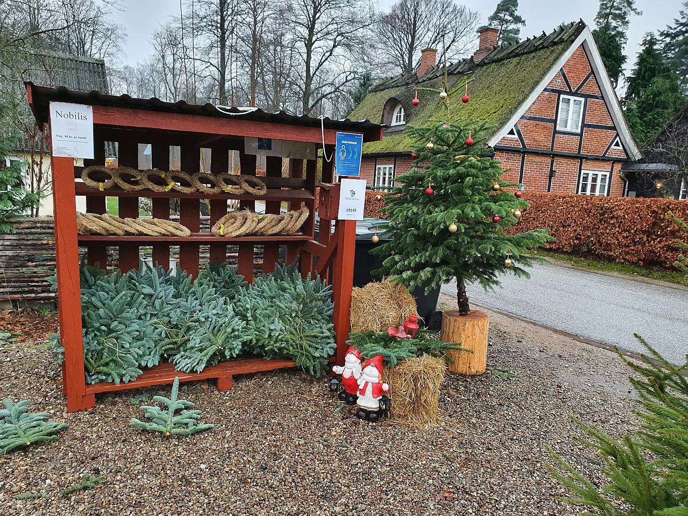 Salget foregår fra Skovfogedstedet ved Aggersvold Savværk, hvor der har været solgt træer i over 40 år. Vi har selvbetjeningsbod 14 dage før 1. søndag i advent. Fra 3. søndag i advent er der betjening alle ugens 7 dage. Alt er tydeligt mærket, så du kan se hvad tingene koster.